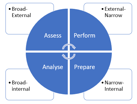 Figure 2 shows us that there is more to attention than focussing on one factor intently. One type, labelled ‘assess’, is when we focus on stimuli that is external to us and broad in nature. For example, a referee doing a pitch inspection or checking players are in position before kick-off. Attention may then move towards what is called ‘perform’: this is the neutral state of attention that a referee has when officiating. Focussing on what is going on around them (external stimuli), but with a narrow range. For instance, paying attention to a player with the ball trying to beat an opponent or a defender making a tackle. Before and during the game, the referee may shift to ‘prepare’, concentrating on themselves (internal) and on a very specific (narrow) focus. For instance, in an attempt to calm down they may pay attention to their breathing or remind themselves of their goals. Finally, they may analyse: where they consider all the things that may impact their performance at once.