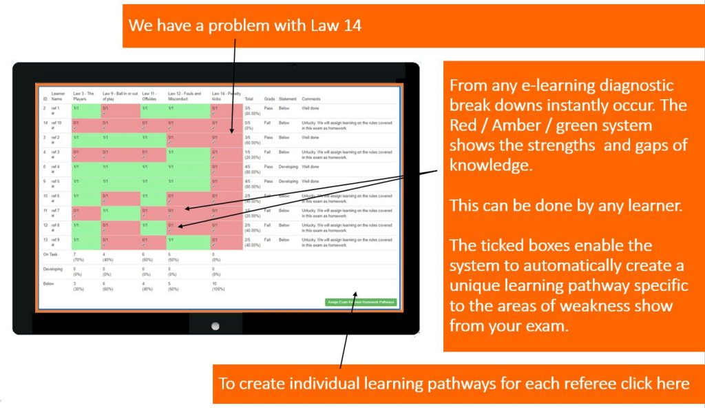 Access to masterclass lessons, to acknowledge and understand fouls and misconduct, improve referees drop zone. Followed by questions of understanding ensuring referees continuly improve their knowledge base at their speed in their own time.